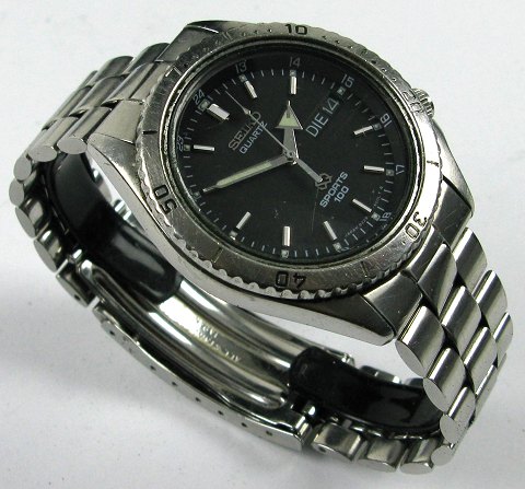 Seiko herrearmbåndsur model Sports 100, Ref. nr. 8229-6000, i urkasse og med lænke af stål. Sort skive med stregindikationer, central sekundviser og dag/datovisning på tysk i #3 positionen. Quartsværk. Urkasse diameter 39 mm.