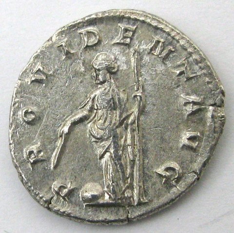 slået i Rom; IMP GORDIANVS PIVS FEL AVG, Draperet buste af Gordian iført strålekrone og kyras; PROVIDENT AVG, Providentia stående mod front, hoved mod venstre, stav i højre hånd over globe ved fødder, scepter i venstre. RIC 149.