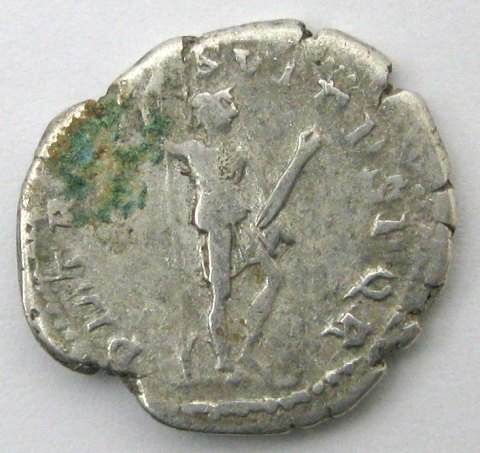 Trajan, AR Denarius, 116 e. Kr., slået i Rom; IMP CAES NER TRAIANO OPTIMO AVG GER DAC; draperet buste af Trajan iført laurbærkrans; PM TR P COS VI PP SPQR; Virtus stående mod højre, spyd i højre hånd, parazonium i venstre. RIC 355.