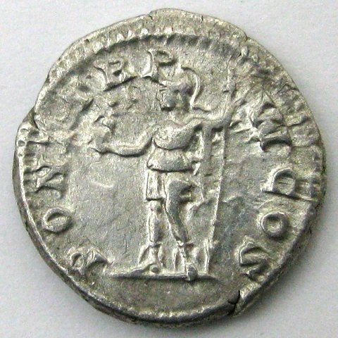 slået i Rom; ANTONINVS PIVS AVG, Draperet buste af Caracalla iført laurbærkrans; PONT TRP VI COS, Roma stående mod venstre med Victoria i højre hånd og spyd i venstre. RIC 69.