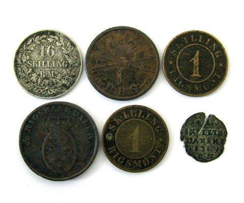 Skillingsmønter. 1 Skilling sølv 1719, 1 Rigsbankskilling 1818, 1 Rigsbankskilling 1852, 16 Skilling Rigsmønt sølv 1856 1 Skilling 1860 samt 1 Skilling 1867