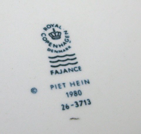 Piet Hein for Royal Copenhagen, smørbrædt fra 1980 af fajance med kloge ord fra kunstneren samt 4 stk. Piet Hein ellipse æg af forsølvet metal, tænkt som drinks køler som ikke fortynder sprutten. Som finesse kan disse superellipse æg også stå på hovedet og bruges som anti stress legetøj.