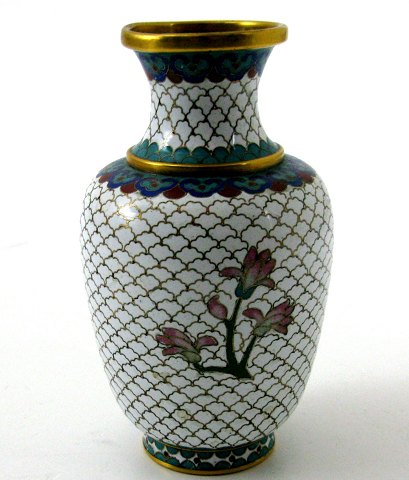 Cloisonné vase, dekoreret med lotustrĉ og fugl samt kinesisk ornamentik. H. 13 cm. 20. ċrh.
