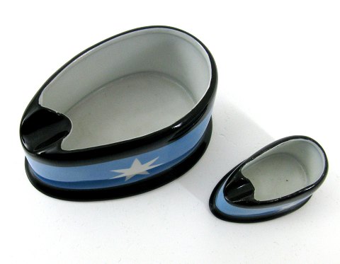 Par askebægre med Mærsk logo i form af skibsskorstene. L. henholdsvis 11 og 6,5 cm. Cigaræskebæger med lille afslag i bunden. Ingen fabrikationsmærke.