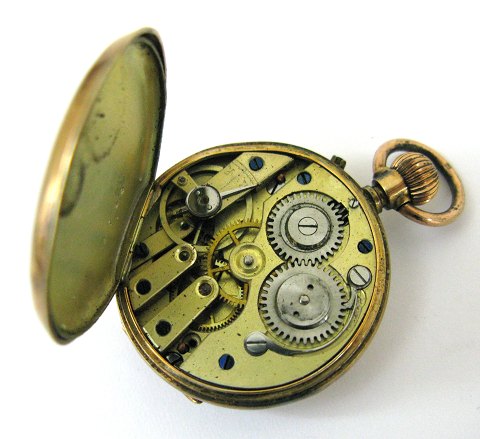Damelommeur i urkasse og med bagkapsel af 14 kt. guld, hvid emailleskive og romertal. Urkasse diameter 33 mm. Vægt 29 gr.