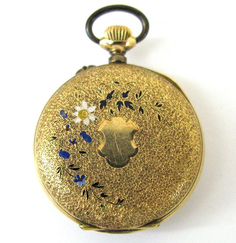 Schweizisk damelommeur i dekoreret urkasse og med bagkapsel af 14 kt. guld. Emailleskive med romertal og minutindikation i arabertal. Urkasse diameter 32 mm., vægt 24 gr.