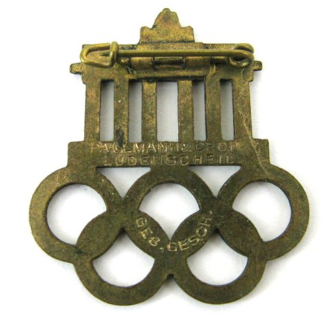 Nål af emaillebelagt metal i form af Brandenburgertoret og de fem olympiske ringe. Revers fabrikationsmærke og "Ges. Gesch" for patentbetegnelsen "Gesetzlich Geschützt". Ca. 35 x 30 mm. Fremstillet hos Paulmann & Crone, Lüdenscheid.