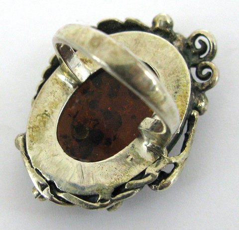 Skønvirke ring af sterling sølv, prydet med chabochonslebet ravstykke med biologiske indeslutninger. Ring Str. 54,