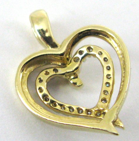 Vedhæng af 14 kt. guld i form af dobbelthjerte, prydet med brillantslebne diamanter, samlet ca. 0,10 ct. L. 19 mm.