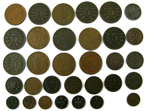 2x 5 øre 1876, 2x 1896, -99, 1902, -13, -22, -30, 2x -52, -55, 2x -58 samt 2 øre 1877, -84, -89, -93, -97, -1902, -07, 2x -13, -35, -45 jern og 1 øre 1899, 1907, -14, -40, 2x -43 jern, -45 jern. (32)