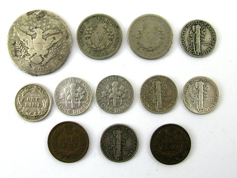 USA Half Dollar 1897 og 7x Dimes 1911 - 1945. Desuden to 2x 5 Cents 1897 og 1910 samt 2x 1 Cent 1897-1908. (12).