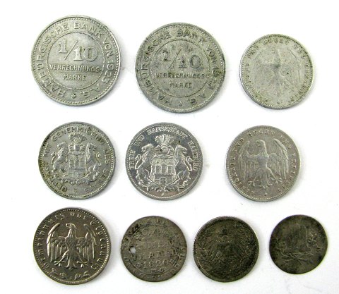 Lot bestående af 200.000 Mark 1923, 2x 200 Mark 1923, 2x 1/10 og 5/100 Verrechnungsmarke 1923, ½ Reichsmark 1906, 1 Mark 1934 samt Schillingmønt og 24/1 Thaler 1820 sølv.