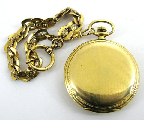 Tysk lommeur i urkasse af forgyldt metal. Champagnefarvet, struktureret skive med arabertal og separat sekundviser. Urkasse diameter 52 mm. Urkæde af metal medfølger.