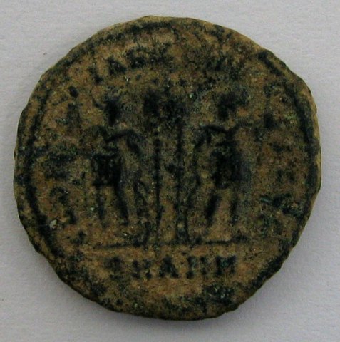 Avers: FL IVL CONSTANS NOB C, buste med laurbærkrans og kyras. Revers: GLORIA EXERCITVS, to soldater med spyd og skjolde, to faner mellem dem, SMANH forneden. RIC VII Antioch 89, ualmindelig