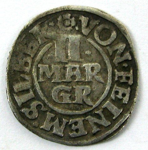 Fyrst Frederick Ulrick (1613-1634), barnebarn af Frederik III gennem Elisabeth af Danmark. Avers: DEO ET PATRIĈ, kronet VF-monogram, 16Z7; Revers: VON FEINEM SILBER, II MAR GR. KM# 264.
