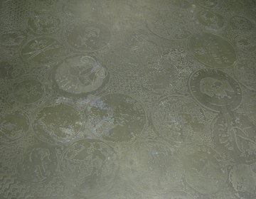 Møntsamlerens kvadratiske sofabord af palisander med hjørnepartier af hamret metal. Plade af grøngrå patineret metal præget med overdimensinerede, gamle mønter. Ca. 101 x 101 x 50 cm.