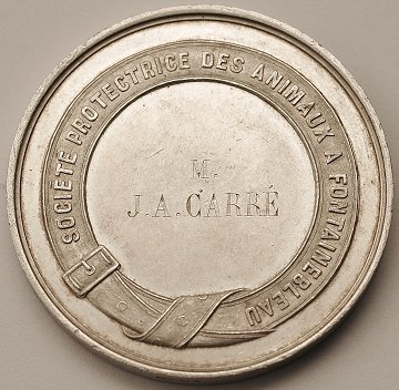 Veludført fransk medaille af sølv, præget m. Fontainebleaus byvåben på bs. og teksten "SOCIÉTÉ PROTECTRICE DES ANIMAUX A FONTAINEBLEAU / M. J.A. CARRÉ, 19. årh.s slutning. Ø. 45 mm.