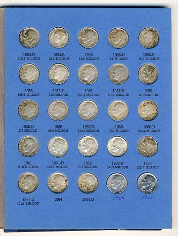 Collection of dimes 1946---1964 in silver plus 1965--68 in nickel. In folder - total 52 pcs