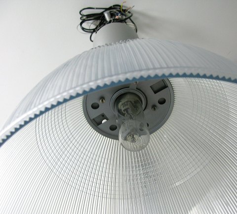 Luminex industripendel med fatningshus af aluminium og reflektorskærm af kanneleret plexiglas. H. 65 cm., diameter 42 cm. Ca. 3 meter original wireophæng med påmonteret ledning medfølger.