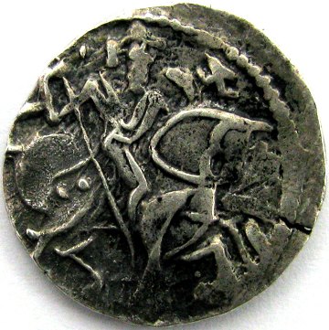 Revers: Kriger til hest med spyd mod højre, tre prikker på hestens bagdel. Symboler til højre.