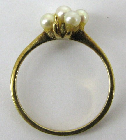 Ring af 14 kt. guld, prydet med klase af oprindelig 7 stk. 3 mm. kulturperler (1 perle mangler). Ring Str. 55, samlet vægt 1,8 gr.