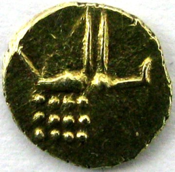 Rajaerne af Kandy. 16. århundrede til ca. 1760. Design baseret på Vira Raya fanam eller "ponnam". Guld, ca. 12-14 karat. 0,38 gram totalvægt.