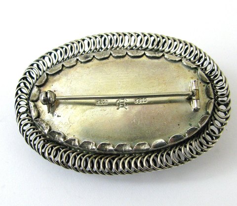 Broche af sølv, dekoreret med chabochon slebet ravstykke 48 x 28 mm., ydermere prydet med perlemor. Broche 58 x 38 mm., samlet vægt 27 gr. Stemplet ÅC og 835.