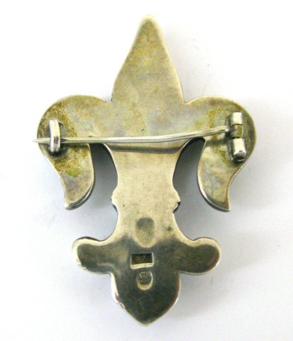 Broche af sølv 826 i from af den franske lilje. Guardainstempel for Simon Groth. L. 50 mm., vægt 33 gr.