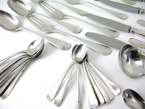 P. Hertz spisebestik af sterling sølv bestående af 7 middagsgafler, 8 middagsknive, 3 middagsskeer, 6 dessertskeer, 6 dessertgafler, 7 kaffeskeer, 10 théskeer, potageske og marmeladeske. 49 dele i alt. vægt uden knive 1,570 kg.