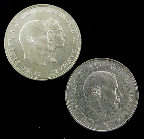 Erindringmønter, Christian X, 2 kr. sølv *25 års regeringsjubilæum 5. maj 1937* og Frederik IX, 5 kr sølv *Dronning Ingrids sølvbryllup 24 maj 1960.