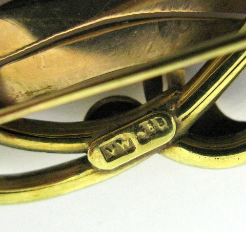 Broche af 14 kt. guld i form af sløjfe med dekorationer, L. 50 mm., vægt 4,7 gr.