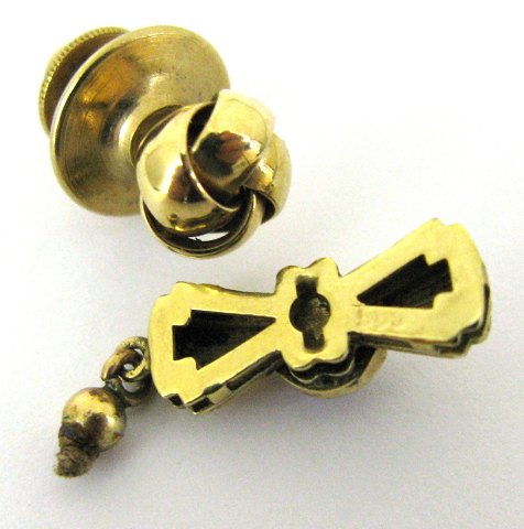 Lot bestående af skjorteknap, diameter 7 mm. samt sløjfeformet kædelås, prydet med chabochonsleben ametyst. Samlet vægt 2 gr.