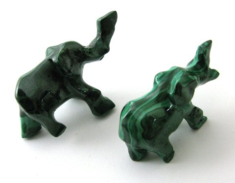 To elefanter, slebet ud og poleret af malakit fra Kenya. L. 45 og 40 mm.