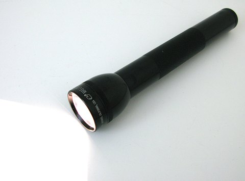 Kæmpe lommelygte, L. 31 cm. Reflektor diameter 57 mm. Tidligere brugt af Dansk Politi.