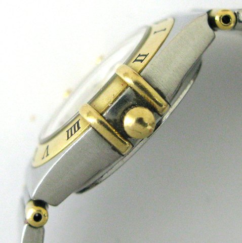 Omega Constellation damearmbåndsur i urkasse og med lænke af guld/stål. Guld farvet skive med stregindikationer, Quartzværk. Urkasse diameter 23 mm. Serie nr. 56XXXXXX