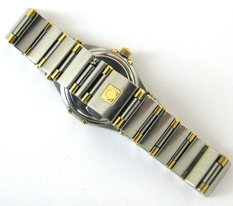 Omega Constellation damearmbåndsur i urkasse og med lænke af guld/stål. Guld farvet skive med stregindikationer, Quartzværk. Urkasse diameter 23 mm. Serie nr. 56XXXXXX