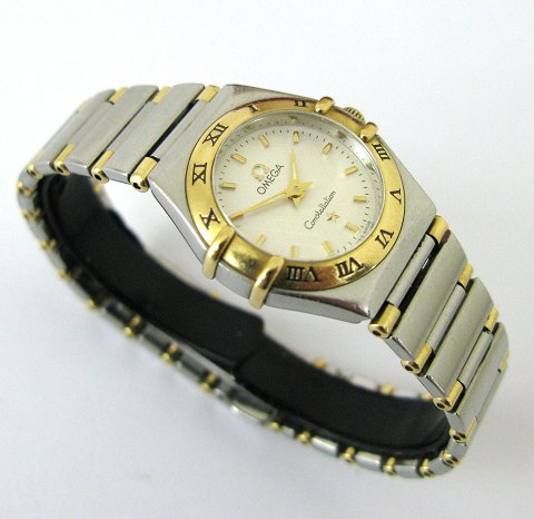 Omega Constellation damearmbåndsur i urkasse og med lænke af guld/stål. Guld farvet skive med stregindikationer, Quartzværk. Urkasse diameter 23 mm. Serie nr. 56XXXXXX