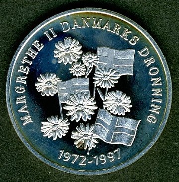 Medaille af sølv, præget i anledning af Dronningens 25 års regeringsjubilæum d. 14. januar 1997.
