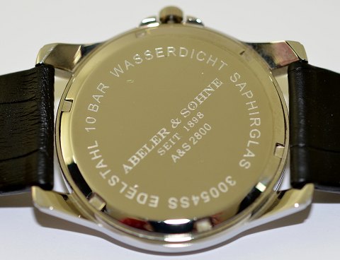 Abeler & Sohne, herreur, kvartsværk, 41 mm diameter stålkasse med safirglas, vandtæt til 10 bar.