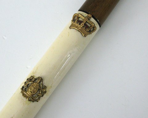 Politistav af delvist hvidbemalet træ, brugt til færdselsregulering i 1950'erne. L. 52 cm. På skaftet er der monteret rigsvåbenet og krone af messing.
