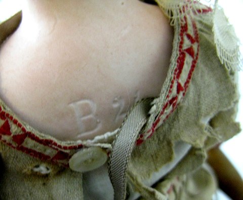 Dukke fra ca. 1915 med skulderhoved af bisquit porcelæn med fast isatte øjne, åben mund og lys mohairparyk. Hoved mærket B 2/2 (A.M.) Underarme ligeledes af bisquit porcelæn, monteret på stofkrop med bevægelige arme og ben. Dukken er iført datidigt tøj og sko. Gl. dukkegyngestol medfølger. Dukke L. 37 cm.