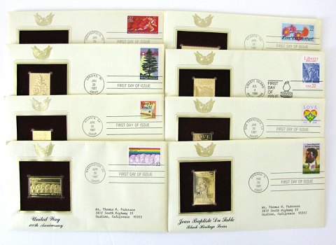 Lot amerikanske førstedagskuverter, prydet med guldfarvet plastkopi af berømte amerikanske frimærker. Kuverterne er sendt fra forskellige byer i USA til samme modtager i Gustine, Californien.