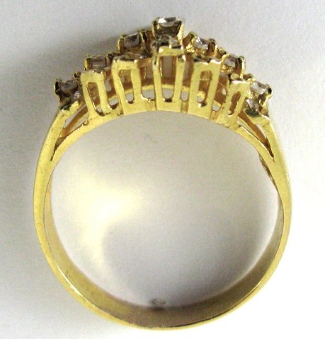 Ring af 18 kt. guld med forhøjet front, prydet med talrige, facetslebne hvide safirer. Ring Str. 53½, samlet vægt 4 gr.