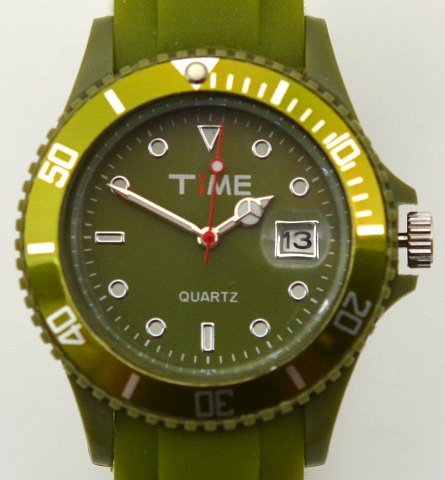 Time, unisex ur, quartz værk, grøn plastkasse, 39 mm diameter, med blød gummirem, stål bagkasse. Plastglas med datolup ved kl. 3