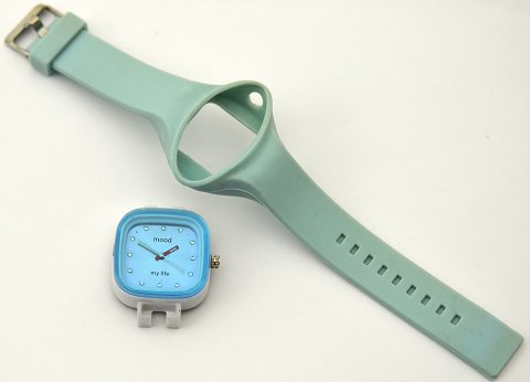 Mood "my life" ur. Urkasse af plastik, 38 x 38 mm med blåt plastik glas. omgivet af lys blå gummi med integreret gummi rem og metal spænde. Der er ingen dato og uret er ikke vandtæt.