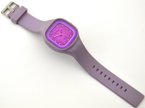 Mood "my life" ur. Urkasse af plastik, 38 x 38 mm med lilla plastik glas. omgivet af lavendel farvet gummi med integreret gummi rem og metal spænde. Der er ingen dato og uret er ikke vandtæt.