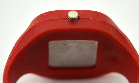 Mood "Sweet" ur. Urkasse af plastik med rød skive, 45 x 45 mm med plastik glas omgivet af rødt gummi med integreret gummi rem og metal spænde. Der er ingen dato og uret er ikke vandtæt.