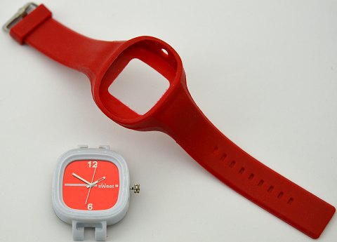 Mood "Sweet" ur. Urkasse af plastik med rød skive, 45 x 45 mm med plastik glas omgivet af rødt gummi med integreret gummi rem og metal spænde. Der er ingen dato og uret er ikke vandtæt.