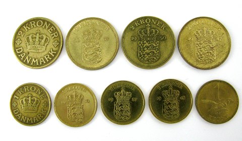 2 kr 1924, -47, -57 og 1959 og 1 kr 1930, -47, -48, -57 og 1958