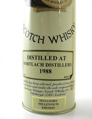 3/4 lt. 40 % VOL single malt whisky *Signatory Millenium Edition*, brygget i 1988. Komplet i original indpakning med Dansk SKAT banderole.
